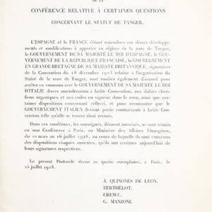 TANGER 1923-1928 - Protocole final de la conférence relative à certaines questions concernant le statut de Tanger. Protocole final de la conférence relative à certaines questions concernant le statut de Tanger. [Lettres se rapportant à diverses clauses de l’accord signé à Paris le 25 juillet 1928 pour la révision de la convention du 18 décembre 1923 relative à l’organisation du statut de la zone de Tanger.] 80€