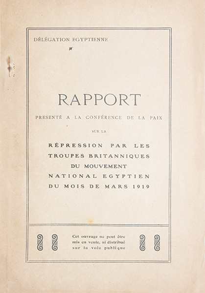 Recueil de trois pièces officielles : les réactions du jeune mouvement national égyptien à la suite de la décision prise lors de la “Conférence de la paix” de confirmer le protectorat de la Grande-Bretagne sur lÉgypte et des premiers mouvements insurrectionnels qui s’en suivirent. Présenté à la Conférence de la paix, le premier rapport concerne les événements de mars 1919 : après l’arrestation et l’exil de trois dirigeants du Wafd (parti nationaliste égyptien), de graves troubles secouèrent l’Égypte causant un millier de morts égyptiens et trente du côté anglais. Les 3 planches de photos représentent des sévices infligés par les Anglais à des citoyens égyptiens.