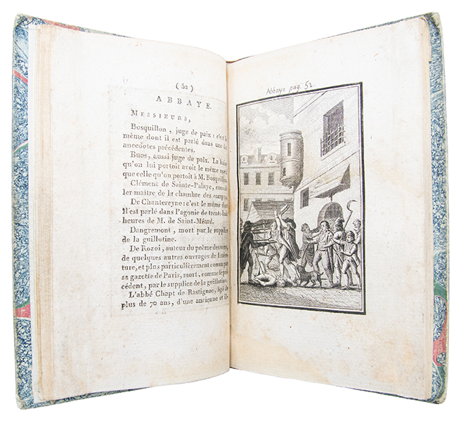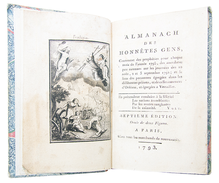 Septième édition, la plus complète selon Grand-Carteret, de cet almanach contre-révolutionnaire, illustrée de deux planches figurant des scènes de massacres. Par Galart de Montjoie, pseudo. de Félix Ventre de La Touloubre (1746-1816), ancien rédacteur de “LAmi du Roi”, futur conservateur de la bibliothèque Mazarine. Louvrage a été attribué à tort à Sylvain Maréchal. Lalmanach réunit prophéties, fables et réflexions politiques, accompagnées danecdotes sanglantes sur les journées révolutionnaires daoût et septembre 1792. Il comprend des listes détaillées des victimes, classées par lieux de détention, formant un véritable mémorial des exécutions. Sont notamment évoqués les massacres de lHôtel de la Force et du couvent des Carmes, ainsi que le sort réservé à la princesse de Lamballe, avec, in fine, une liste des personnes “amenées dOrléans pour y être égorgées à Versailles”. Le ton, visant à dénoncer la barbarie révolutionnaire et à susciter lindignation du lecteur, est violemment polémique: “Des monstres furieux buvoient le sang humain” (p. xxi). (Grand-Carteret, Almanach, ‘Almanach’, 1087. Monglond, II, col. 960-961. Tourneux, 3487c). Ex-Libris gravés d’Etienne Délicourt (1809 – 1883) et de Jacques Laget. Rousseurs, taches et brunissures éparses. Exemplaire bien relié à l’époque.