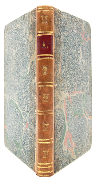 In-16 (130 x 85 mm), demi-veau blond, dos orné de doubles filets gras en place des nerfs et d'un fer à l'urne répété au centre, pièce de titre (un discret "A") sur veau rouge (reliure de l'époque), (2), xx, p. 24-144, 2 planches gravées.