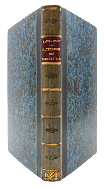 Edition originale complète des quatre cahiers du ‘Catéchisme des industriels’, publiés entre décembre 1823 et juin 1824 ; ensemble dune grande rareté, le quatrième fascicule, non mis dans le commerce, nayant subsisté quen un très petit nombre dexemplaires. La collation est conforme aux descriptions de Mori et Mazzone. Oeuvre de maturité de Claude Henri de Saint-Simon, il constitue lune des formulations les plus achevées de sa pensée économique et sociale et synthétise son projet de réorganisation de la société autour du principe industriel. Adoptant la forme didactique du catéchisme, louvrage soutient le transfert du pouvoir des classes dites oisives aux “industriels”, entendus comme lensemble des producteurs utiles. A un ordre fondé sur les privilèges de naissance se substituerait une organisation rationnelle dirigée selon le principe de capacité, ayant pour finalité lamélioration du sort de la classe la plus pauvre et la plus nombreuse ; la science et les savants y occupent une place directrice. Le troisième cahier, intitulé “Système de politique positive”, fut rédigé par Auguste Comte avant leur rupture ; il contient la célèbre “Parabole”, qui valut à Saint-Simon des poursuites judiciaires. Fondé sur une philosophie du progrès qui fait de la société industrielle laboutissement nécessaire du développement historique, ce texte exerça une influence décisive tant sur lindustrialisme que sur le socialisme utopique et le positivisme du XIXe siècle. (En français dans le texte, 236. Fournel, p. 30-32. Mazzone, 105-108. Mori, 130-133). Rousseurs éparses. Fine et belle reliure de Laurenchet, dans le goût de l’époque.
