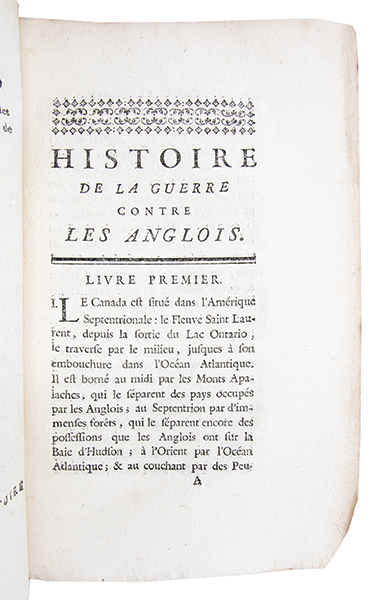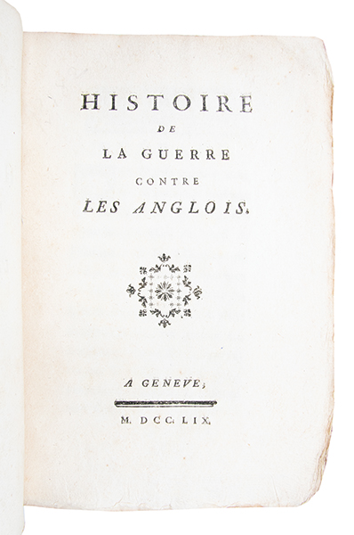 Édition originale, publiée à Genève en 1759. Cet ouvrage anonyme, attribué à l’historien Étienne Joseph Poullin de Lumina, constitue un récit contemporain des débuts de la guerre de Sept Ans, conflit souvent considéré comme la première guerre mondiale, qui oppose notamment la France à la Grande-Bretagne pour la suprématie coloniale. Le texte se concentre sur le théâtre nord-américain du conflit, connu sous le nom de “French and Indian War”, dont les opérations se déroulent en grande partie en Pennsylvanie occidentale et concernent directement la Nouvelle-France. L’auteur y livre une description du Canada, un récit de l’évacuation de la vallée de l’Ohio, et retrace l’histoire des opérations militaires françaises en Amérique. Parmi les éléments les plus notables relevés par Sabin figure l’accusation portée contre George Washington d’avoir ordonné l’assassinat de Jumonville, épisode fondateur qui précipita l’embrasement du conflit. (Howes, p. 517. Sabin, 64720). Quelques petites rousseurs éparses. Très bon exemplaire, imprimé sur papier vergé fort, entièrement non rogné, témoins conservé, tel que paru.