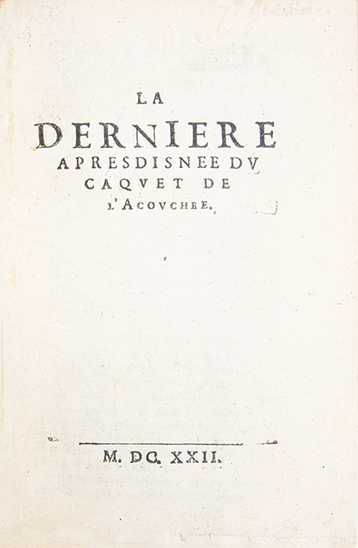 Suite anonyme du célèbre ‘Caquet de laccouchée’, Le titre fait référence à la coutume qu’avaient les bourgeoises de se visiter lorsque l’une d’elles était en couches. Le narrateur, un Parisien en convalescence à qui son médecin prescrit de se distraire, se rend rue Quincampoix et restitue les caquetages et commérages des femmes entourant sa cousine qui vient d’accoucher. Chronique acerbe de la vie parisienne où se mêlent des considérations sur les personnalités de l’époque, citées nommément, la politique, la religion, l’économie, les moeurs, etc. Le texte est considéré comme une bonne source sur la vie quotidienne et les représentations de la femme dans ce premier quart du XVIIe s. Cf. P. Brun, ‘La Bourgeoisie au XVIIe siècle d’après Les Caquets de L’accouchée’, Revue d’Hist. Litt. de la France, n°2, 1896, p. 192-203. (Arbour, 10458. Lindsay et Neu, 4732.Mercier, ‘La litt. facétieuse sous Louis XIII’, n°87). Bon exemplaire.
