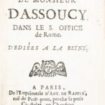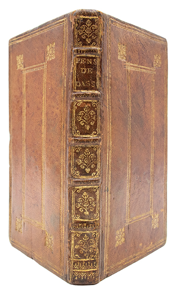 Édition originale de cette oeuvre singulière de Charles Coypeau d’Assoucy (1604–1674), écrivain, poète burlesque et musicien accompli, proche de Molière et du cercle des libertins érudits. Les “Pensées” furent rédigées lors de son emprisonnement à Rome, en décembre 1667, après son arrestation pour faits présumés d’athéisme et de libertinage. “Vers 1662, il partit pour Rome ; il y mena une vie de luxe et de paresse, jusqu’au jour où ses attaques contre certains prélats réveillèrent des accusations de libertinage portées contre lui et le firent enfermer dans les prisons du Saint-Office” (Grente, ‘Dict. XVIIe’, p. 77-78). Depuis sa prison, l’auteur développe une réflexion critique sur les diverses formes de dissidence religieuse, protestants, déistes, athées ou panthéistes. Mêlant autobiographie, polémique et satire, l’ouvrage revendique avec force la liberté de conscience et le droit au libre examen. Plus qu’un traité philosophique, il constitue un témoignage rare sur la condition des libertins érudits au XVIIe siècle, porté par une écriture personnelle où alternent gravité et burlesque. Cyrano de Bergerac, présenté comme un proche, est évoqué, de même que ses “Empires de la Lune”, aux pages 50 à 53. Homosexuel et libertin revendiqué, d’Assoucy fut emprisonné à trois reprises pour des chefs d’accusation de sodomie aggravés d’impiété ; il ne dut son salut qu’à de puissantes protections, jusqu’à l’intervention royale de 1673 (cf. M. Alcover, “Un gay trio: Cyrano, Chapelle, Dassoucy”, in ‘L’Autre au XVIIe s.’, p. 265–275). (Mongrédien, ‘Bibliographie des oeuvres de Dassoucy’, R.H.L.F., 1932, I, p. 101-102, n°5). Rare, seulement cinq exemplaires sont conservés en institutions publiques. Quelques petites épidermures. Provenance Hyacinthe Théodore Baron (1707-1787), médecin militaire et bibliophile français, avec son ex-libris armorié gravé. Très bel exemplaire dans une jolie reliure de maroquin à la Duseuil de l’époque.
