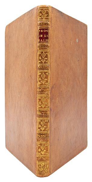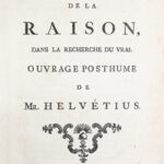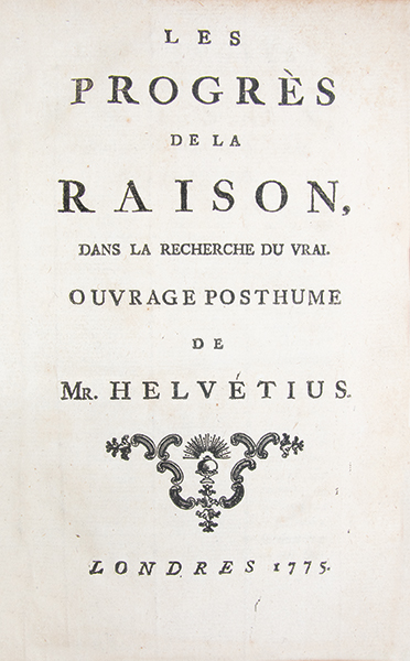 Édition originale, et unique, de ce texte posthume, publié quatre ans après la mort de l’auteur (1771) sous adresse londonienne fictive, l’impression étant en réalité de La Haye. Le titre est un programme en trois mots : la raison, entendue au sens sensualiste et empirique, progresse vers une vérité affranchie de toute tutelle religieuse ou métaphysique, ce qui explique la prudence de l’adresse fictive. L’ouvrage prolonge ainsi le matérialisme d’Helvétius, notamment sa critique de toute explication spiritualiste du cerveau, dans la continuité de ‘De l’Esprit’ (1758) et de ‘De l’Homme’ (1772). Son authenticité, reçue par la tradition, a été mise en doute. Le texte fut repris dans les Œuvres complètes éditées par La Roche (Didot, 1795, 14 vol.) (Smith, ‘Bibliography of the writings of Helvétius’, A7, p. 365. Tchemerzine-Scheler, III, 680). Bon exemplaire, bien conservé dans sa première reliure.