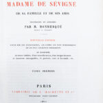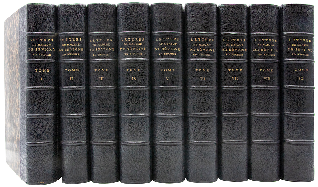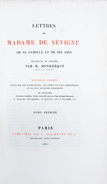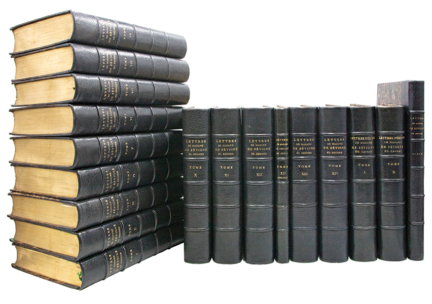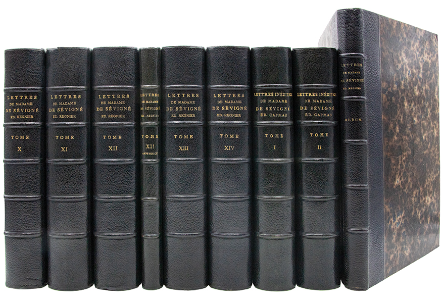 Exemplaire le plus complet de la monumentale édition de référence des Lettres de Madame de Sévigné, établie par Louis Monmerqué dès 1818, reprise et augmentée par la librairie Hachette sous la direction dAdolphe Régnier, dans le cadre de la “Collection des Grands Écrivains de la France”. Elle repose sur lexploitation des exemplaires interfoliés annotés par Monmerqué ainsi que sur des sources alors inédites. Le corpus se compose de quinze volumes et d’un volume d’appendice au tome XII (“additions et corrections”) auxquels sajoutent deux tomes de “lettres inédites” recueillies par Charles Capmas et publiées en 1876. Lensemble est complété par un rare album iconographique, paru en 1868, réunissant une planche héraldique en couleurs représentant les armoiries des familles Rabutin, Sévigné, Grignan et Simiane, quatre portraits, huit vues de demeures et seize fac-similés dautographes, chaque élément étant accompagné dune notice explicative. Cette édition a été remarquée dès sa parution “pour la pureté du texte, le nombre, lexactitude et la curiosité des notes ( ); rien, en un mot, na été négligé pour en faire un monument” (Ed. Boutaric, recension in “Bibliothèque de lÉcole des chartes”, 1868, XXIX, p. 207-208). De fait, elle se distingue par sa rigueur philologique et la précision de son appareil critique, intégrant un grand nombre de notes historiques et de lettres inédites. Son coût élevé en réservait laccès principalement aux grandes bibliothèques, “la distinguant nettement des éditions abrégées ultérieures, dépourvues dun appareil critique dune telle ampleur”. Par son exhaustivité, sa fiabilité et sa profondeur analytique, cette édition demeure aujourdhui encore linstrument de référence indispensable pour létude de la correspondance sévignéenne. Quelques piqûres éparses. Ex-libris armorié imprimé aux armes du Château de Plessis-Brion, demeure de la famille des comtes de Bréda. Très bel exemplaire, établi dans une luxueuse reliure de maroquin, imprimé sur papier vergé fort, non rogné.