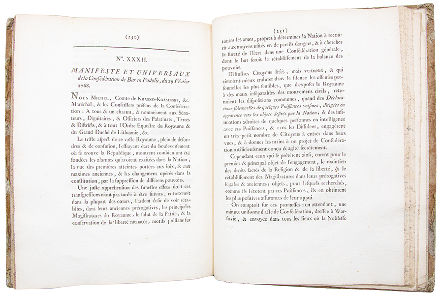 Première édition française, augmentée d’une seconde partie en édition originale, la seule complète du “Manifeste de la République confédérée de Pologne”, rédigé dans le cadre de la Confédération de Bar, active de 1768 à 1772. Ce texte est proclamé dans ses premières versions à la fin de lannée 1769, notamment dans létat daté du 15 novembre 1769, puis repris et diffusé sous cette forme imprimée en 1770. La Confédération de Bar, formée le 29 février 1768 dans la forteresse de Bar en Podolie (alors province de la République des Deux Nations), représente le premier soulèvement national polonais moderne contre l’ingérence étrangère. Il sinscrit dans le vaste soulèvement armé de la noblesse polono-lituanienne dirigé à la fois contre le roi Stanislas II Auguste Poniatowski (1732-1798) et contre la tutelle politique exercée par lEmpire russe sur la République des Deux Nations. Ce mouvement, qui mobilisa jusqu’à 100 000 confédérés, aboutit à une guerre de quatre ans marquée par des alliances diplomatiques avec la France et l’Empire ottoman, et précède directement le premier partage de la Pologne en 1772. Contenu et argumentation : Le manifeste proclame lexistence dune “République confédérée de Pologne” et affirme la continuité juridique de la nation face à une autorité royale jugée illégitime. Son argumentation repose sur la souveraineté nationale, le droit de résistance, la défense de la religion catholique et la sauvegarde des libertés traditionnelles de la noblesse, dans un langage qui marque le passage dun discours nobiliaire ancien à une rhétorique politique plus moderne. Cette évolution rhétorique anticipe les idées des Lumières polonaises et influence les débats sur le républicanisme en Europe centrale. Attribution : La question de lattribution demeure débattue. Le texte est traditionnellement associé à Ignacy Bohusz (1746-1833), jésuite, historien et secrétaire de la Confédération, attesté comme actif dans les milieux juridiques et politiques confédérés dans les années 1760-1770. Lhistoriographie lui reconnaît un rôle probable dans la formulation doctrinale et juridique du manifeste ; en tant que secrétaire de la Confédération, Ignacy Bohusz est documenté comme contributeur clé aux documents idéologiques, aux côtés d’autres figures comme Micha Wielhorski (1730-1794). Certaines sources historiographiques évoquent également un rôle pour Józef Bohusz dans les aspects doctrinaux, cette dualité d’attribution reflétant les débats en cours dans l’historiographie polonaise. Le nom de Micha Jan Pac (1730-1787), grand magnat lituanien, grand maréchal de Lituanie et lun des principaux chefs de la Confédération de Bar, apparaît quant à lui comme celui dun auteur, dun inspirateur ou dun garant politique du texte. Micha Jan Pac joua un rôle majeur dans lorganisation militaire et diplomatique du mouvement, notamment en Lituanie, et participa activement à lélaboration de son discours idéologique à destination des puissances européennes. Les confédérés sollicitèrent notamment les avis de philosophes des Lumières, Jean-Jacques Rousseau et Gabriel Bonnot de Mably en 1770-1771 pour des réformes constitutionnelles, bien que ces consultations n’aient pas abouti à une mise en uvre immédiate. Diffusé à petit nombre d’exemplaires, de manière très limitée mais stratégique tant à lintérieur de la République des Deux Nations quauprès des chancelleries étrangères, le “manifeste” constitua un instrument essentiel de la propagande confédérée. Cette traduction française, publiée peu après 1769 et aujourdhui rarissime, accentua cette dimension internationale ; elle est augmentée dune seconde partie absente de loriginal polonais, réunissant quarante-cinq manifestes, actes et déclarations couvrant la période allant de lélection royale de 1764 à la proclamation de la Confédération de Bar en février 1768, suivie des réponses de ses alliés et de ses adversaires. Cette compilation documentaire unique en fait un recueil exhaustif des origines du mouvement, soulignant son caractère précurseur dans la lutte pour l’indépendance polonaise. Imprimé rare et dun intérêt historique de premier ordre, ce texte constitue un jalon fondamental de la pensée politique polonaise de la fin de lAncien Régime et un précédent intellectuel majeur des revendications formulées après les partages de la Pologne. Il illustre également l’influence croisée entre les idées républicaines polonaises et les Lumières françaises, comme en témoigne l’intérêt de Voltaire pour les affaires polonaises sous le règne de Catherine II. (Estreicher, Karol. Bibliografia polska, t. XVIII. Cracovie : 1901. “Notices relatives aux manifestes de 1769-1770 de la Confédération de Bar”. Konopczy ski, W adys aw. Konfederacja barska, 2 vol. Varsovie : 1936-1938. Notamment vol. II, chapitres consacrés à la doctrine politique confédérée. Rostworowski, Emanuel. Historia powszechna XVIII wieku. Varsovie : 1977. Sections relatives à la Confédération de Bar et à sa production idéologique. Michalski, Jerzy. Articles sur les écrits politiques de la Confédération de Bar. “Kwartalnik Historyczny”, années 1960-1970. Grze kowiak-Krwawicz, Anna. Queen Liberty: The Concept of Freedom in the Polish-Lithuanian Commonwealth. Leiden : Brill, 2012. Chapitres sur la rhétorique confédérée. Belissa, Marc (éd.). Rousseau, Mably et la réforme de la Pologne. Paris : Kimé, 2008. Pour le contexte des consultations philosophiques.) Dos frotté avec manques de cuir sur les mors de plat, coiffes supérieure usée, petite fente à un mors (5 cm). L’ensemble est solide. Bon exemplaire, l’intérieur est frais et bien conservé.