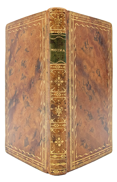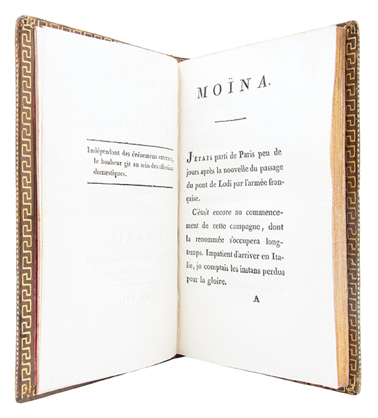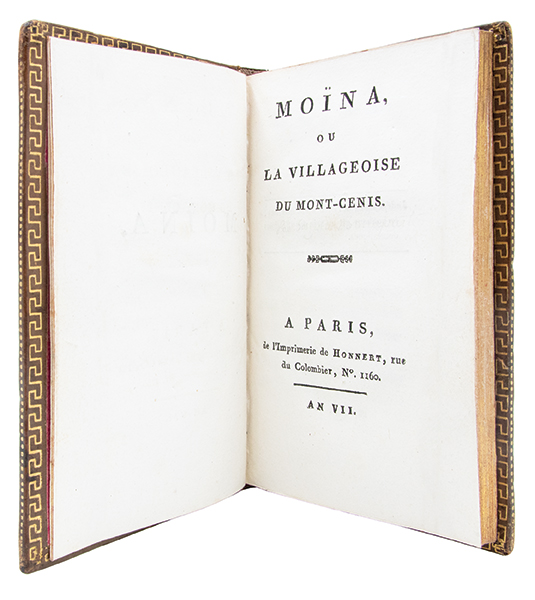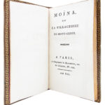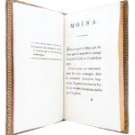 Edition originale de l’unique oeuvre littéraire de Joseph Bonaparte, composée à l’âge de trente ans, à la veille du coup d’État du 18 brumaire. Commencé à la suite d’une rencontre avec un soldat blessé de la campagne d’Italie, puis repris lors d’une halte au Mont-Cenis en juillet 1796, le récit met en scène l’amour contrarié d’une jeune villageoise et d’un militaire français, sur fond de paysage alpin idéalisé. “Avec les accents de J.-J. Rousseau et sous l’influence de Bernardin de Saint-Pierre, Joseph Bonaparte nous livre cette ‘bergerie montagnarde’, qui comporte d’étonnantes réflexions sur le pacifisme et l’inutilité de la guerre. Un ouvrage injustement tombé dans l’oubli depuis plus de deux siècles” (F. Forray, Moina, Éd. Fontaine de Siloé, 2001). Joseph Bonaparte (1768-1844), frère aîné de Napoléon, fut diplomate sous le Directoire avant de régner sur Naples puis sur l’Espagne. Exilé après la chute de l’Empire, il termina sa vie entre les États-Unis et l’Italie, laissant avec Moïna un témoignage littéraire isolé, révélateur de ses idéaux moraux et politiques. WorldCat ne recense que trois exemplaires de cet ouvrage dans le monde, dont un seul dans les bibliothèques françaises, conservé à la BnF. (Davois, Bibliogr. napoléonienne, p. 14 ; Monglond, IV, 1113 ; Quérard, Les Bonaparte et leurs œuvres littéraires, 1845, p. 47). Ex-libris imprimé représentant un serpent s’enroulant sur la haste de l’initiale L. Ravissant exemplaire, imprimé sur papier vélin, très frais, grand de marges, parfaitement relié à l’époque en veau porphyre.
