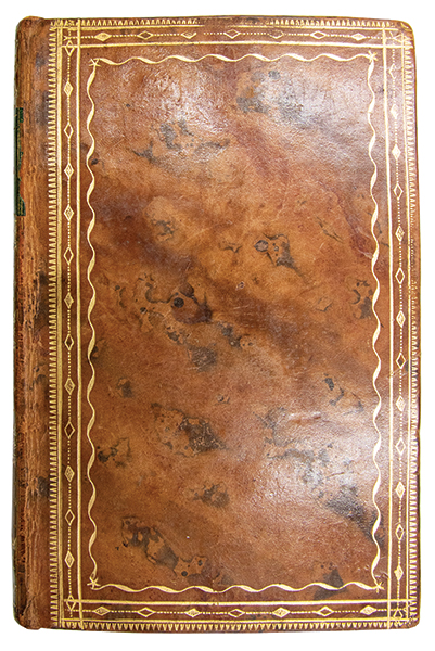 In-16 (125 x 77 mm), veau porphyre de l’époque orné d’un riche décor de style "Consulat", dos lisse garnis de fers à l'urne et quadrilobé cloisonné de roulettes dorées, palettes en tête et pied, jeu de chaînettes et guirlandes dorées en encadrement des plats, pièce de titre de veau vert bronze, roulette sur les coupes, large grecque intérieure, tranches dorées, (4), 103 pages.
