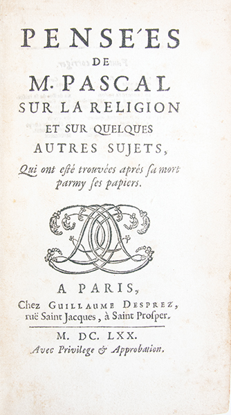 Edition originale posthume, comportant, comme il se doit, le chiffre de Desprez sur le titre, ainsi que la vignette de la Sorbonne à la page 1. Cest lédition dite “de Port-Royal”, première édition collective des “Pensées” de Blaise Pascal, avec, en tête, la préface dEtienne Périer, beau-frère de lauteur, les approbations des docteurs et, à la fin, dix feuillets de table. On ne connaît que deux exemplaires pour lannée 1669, lun à la BnF et lautre à la bibliothèque de Troyes, qualifiée d”édition témoin”. Le privilège est daté du 7 janvier 1667 (achevé dimprimer le 2 janvier 1670), avec, au verso, les “fautes à corriger”. Les fautes mentionnées à lerrata ont ici été soigneusement corrigées à la plume, accompagnées de notes de lépoque portées en marge de quelques pages (39, 48, 276 et 313). Cette édition capitale, établie par le cercle de Port-Royal à partir des papiers laissés par Pascal, est fondatrice de la réception moderne des “Pensées”. (‘En français dans le texte’, n° 96. Maire, IV, n° 3. Petit, p. 207-213. PMM, n° 152. Tchemerzine-Scheler, V, p. 70). Quelques rousseurs et brunissures éparses, minime galerie de vers (env. 6 mm) dans la marge supérieure des cinq premiers feuillets, naffectant pas le texte. Discrètes traces de restauration à la reliure. Bon exemplaire, grand de marges, bien relié à l’époque
