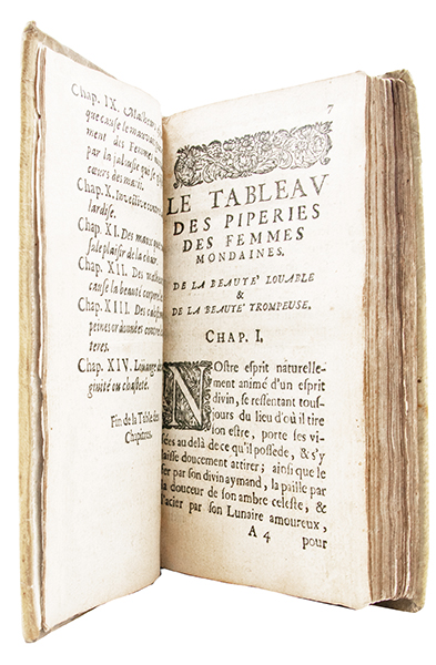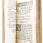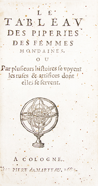 Troisième édition, à la sphère, que Brunet qualifie de “la plus recherchée”. Considérée comme la plus complète et lédition définitive, elle servit de modèle aux rééditions modernes. Lun des sommets de la misogynie au XVIIe siècle, à tel point que certains y ont vu une oeuvre parodique ou satirique, lecture que la critique contemporaine a depuis écartée. Le style, direct et souvent grossier, sinscrit dans une rhétorique de linvective, où la virulence accusatrice prime sur toute prétention morale. Au début du XVIIe siècle, alors que la présence et linfluence des femmes saffirment tant à la cour que dans la société urbaine, un discours misogyne virulent resurgit, alimentant la “Querelle des femmes”, vaste controverse sur la nature et la place des femmes dans la société. Louvrage, demeuré anonyme et probablement dû à un ecclésiastique, sinscrit pleinement dans ce contexte polémique. Il est divisé en quatorze chapitres aux titres évocateurs : “Description de la femme lascive ; Des maux que cause le sale plaisir de la chair ; Des châtiments et peines ordonnés contre les adultères ; Des ruses et artifices de la femme pour perdre lhomme le plus sage ; De la superfluité des habits des femmes”, etc. (Brunet V, 625. Gay, III, 1169 ; Rahir, ‘Elzevier’, 2827). Quelques piqûres et rousseurs éparses. Bon exemplaire, en reliure de vélin rigide de l’époque.