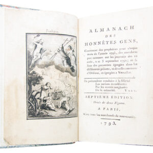 GALART DE MONTJOIE (pseudo. de Félix Louis Christophe Ventre de La Touloubre) Almanach des honnêtes gens, Contenant des prophéties pour chaque mois de l’année 1793, des anecdotes peu connues sur les journées des 10 août, 2 et 3 septembre 1792; et la liste des personnes égorgées dans les différentes prisons, et de celles amenées d’Orléans, et égorgées à Versailles. Septième édition. Orné de deux figures. 350€