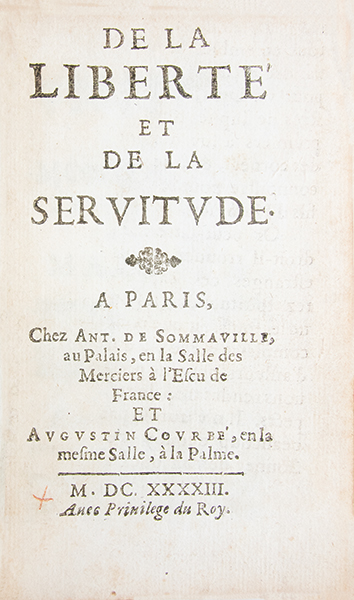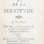 Réunion, à lépoque, de deux traités majeurs du scepticisme français du XVIIe siècle, composés par La Mothe Le Vayer dans les années qui suivirent la mort de Richelieu et de Louis XIII. 1- Édition originale dédiée à Mazarin. Héritier de Montaigne et membre du cercle des « libertins érudits », La Mothe Le Vayer développe dans cet essai une réflexion sur la servitude volontaire, en écho à La Boétie. Il oppose les séductions de la Cour, quil qualifie « dhonorables captivités », à lidéal dune retraite philosophique fondée sur la liberté intérieure, le jugement personnel et lindépendance de lesprit, et formule le programme de son groupe : privilégier une sagesse prudente à la contestation politique ouverte. (Tchemerzine-Scheler, III, 967). 2- Édition originale. Dans cet opuscule sceptique, lauteur interroge la notion de « sens commun », quil confronte aux exigences de la raison et à lhéritage du scepticisme antique. Il montre combien les opinions reçues reposent sur des conventions sociales et des préjugés, mettant en lumière la relativité des jugements humains. Dans un style savant mais vif, La Mothe Le Vayer semploie à ébranler les certitudes collectives, illustrant sa capacité à associer érudition, ironie et critique sceptique. (Tchemerzine-Scheler, III, 969). Petits accrocs aux coiffes et aux coins, mors légèrement frottés. Très bon exemplaire, frais, très bien relié à lépoque.