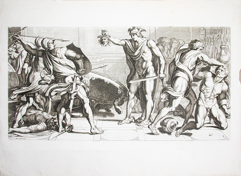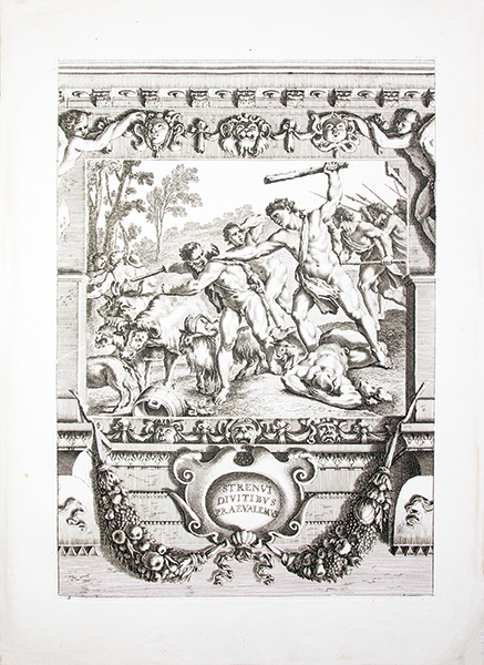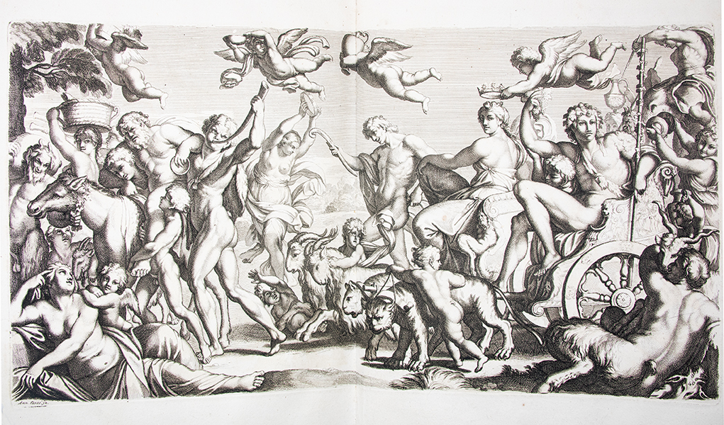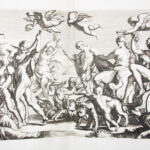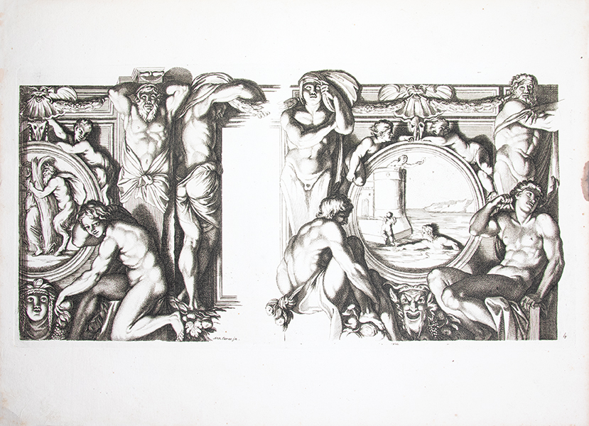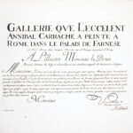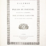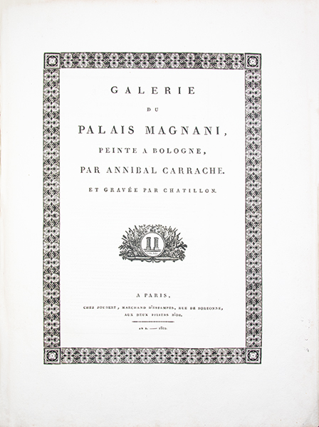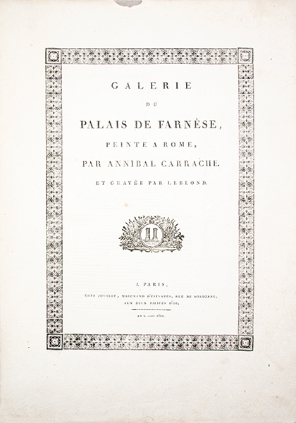 1- Réimpression réalisée à partir des planches originales gravées par Le Blond pour Chéreau, dont un unique exemplaire est aujourd’hui conservé (Bayerische Staatsbibliothek). Cette suite de quarante planches numérotées reproduit les fresques de la « Galerie des Carracci » au palais Farnèse, exécutées à Rome, au tournant du XVIIe siècle, par Annibale Carracci avec la collaboration de ses frères et de plusieurs élèves. Ce cycle mythologique, consacré pour l’essentiel aux amours des dieux, constitue l’un des chefs-d’oeuvre de la peinture décorative de la Renaissance tardive. Les fresques furent gravées pour la première fois à Rome par Carlo Cesio en 1657; les différentes éditions demeurent rarement complètes. Le marchand d’estampes Joubert fit réimprimer en 1802 les matrices gravées environ un siècle plus tôt par Jean Le Blond (1635 ?-1709). Cette réimpression est absente des bibliographies et aucun exemplaire n’est aujourd’hui identifié dans les collections publiques. Tache d’encre en marge supérieure sans atteinte aux planches jusqu’à la planche 11 et petit manque de papier (sur 2 cm) en marge inférieure à la planche 5. 2- Réimpression de la rare suite gravée en 1659 par Louis de Chatillon, d’après les fresques du palais Magnani à Bologne, peintes entre 1589 et 1592 par Annibale Carracci avec la collaboration de Ludovico et Agostino Carracci. Le cycle, consacré à l’histoire de Romulus et Remus constitue un jalon majeur dans l’évolution de la peinture baroque et un modèle déterminant pour la peinture d’histoire au XVIIe siècle. Cette suite qui comprend ici 13 planches numérotées sur les 15 annoncées (les numéros 10 et 13 font défaut) n’est connue en institution qu’à quatre exemplaires. Les deux suites furent diffusées et vendues séparément. Elles s’ouvrent sur une notice de l’éditeur Joubert présentant son catalogue complet, où figurent bien les deux titres décrits. Provenance : « Louis de Saint-Aulaire, rue du Colombier, Hôtel d’Angleterre »: Louis-Clair de Beaupoil, comte de Sainte-Aulaire (1778-1854), ambassadeur, homme politique et membre de l’Académie française. Petit manque de papier (sur 1 cm) en marge inférieure de la planche 1 sans atteinte à la gravure et infime déchirure (sur 1,5 cm) en marge de planche 5 et 14. Reliure de l’époque, abîmée ; piqûres éparses. Rares suites de planches, fraîches et à toutes marges.
