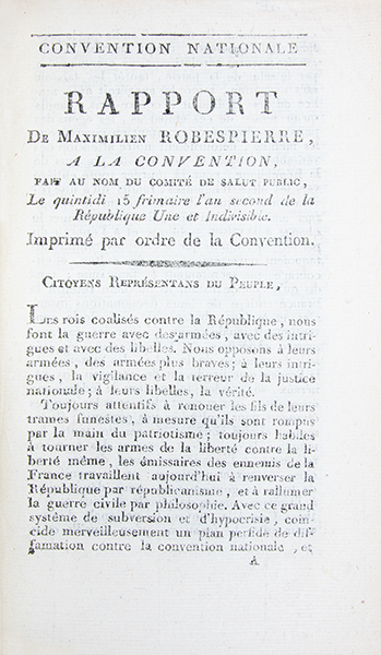1- Rare édition à la date de l’originale imprimée à Arras, la ville de naissance de Robespierre. Dans ce rapport, Robespierre « propose et fait décréter une réponse aux manifestes des rois ligués contre la République » (G. Walter, ‘Robespierre’, p. 737). Le texte du projet de réponse aux manifestes occupe les pages 4 à 11. « Les législateurs qui aiment la patrie et qui ont le courage de la sauver, ne doivent pas ressembler à des roseaux sans cesse agités par le souffle des factions étrangères. Il est du devoir du Comité de Salut public de vous les dévoiler et de vous proposer les mesures nécessaires pour les étouffer ; il le remplira sans doute. En attendant il m’a chargé de vous présenter un projet d’adresse, dont le but est de confondre les lâches impostures des tyrans ligués contre la République et de dévoiler aux yeux de l’Univers leur hideuse hypocrisie ». Bon exemplaire.