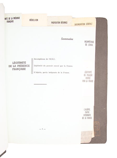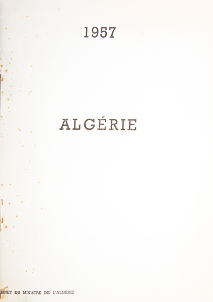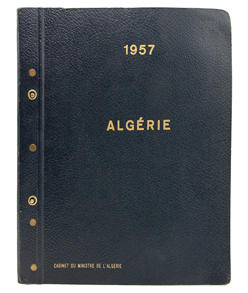Rapport ministériel sur la situation en Algérie en 1957, trois ans après le début des événements. Le volume contient quatre chapitres sur la Rébellion (Nationalisme et séparatismes algériens, rôle des mouvements nationalistes et politiques, thèmes de propagande et réfutations), la Pacification et les Réformes (politiques, administratives, agricoles, sociales) et la Documentation générale (histoire, institutions, aspect social, économie et monographies économiques). Carte et graphiques hors-texte. Carte de visite du ministre de l’Algérie, Robert Lacoste agrafé en page de titre. Quelques rousseurs. Très bon exemplaire.
