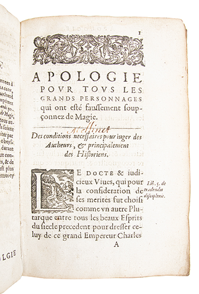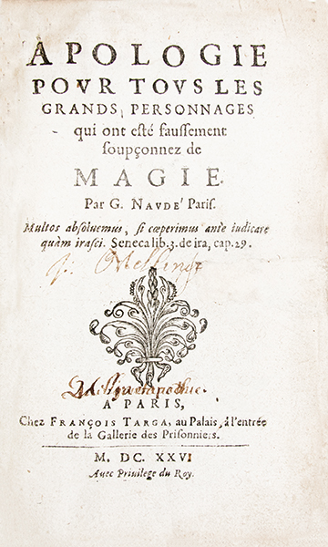 Édition originale rare. Gabriel Naudé (1600-1653), médecin, bibliophile et bibliothécaire du cardinal Mazarin, compte parmi les plus illustres représentants du groupe des « libertins érudits ». Publiée en 1625, l’Apologie’ paraît dans un contexte troublé, marqué par les procès de Théophile de Viau, de la maréchale dAncre et dUrbain Grandier. Naudé y entreprend de défendre les savants et philosophes injustement accusés de magie. En convoquant des figures telles que Pythagore, Roger Bacon ou Pic de la Mirandole, il démontre combien linnovation intellectuelle fut souvent, par ignorance et crédulité, assimilée à des pratiques diaboliques. Considérée comme un manifeste de tolérance intellectuelle, l’Apologie’ illustre lattitude critique des libertins érudits, soucieux de distinguer savoir et superstition, et de défendre la liberté de recherche. Elle occupe une place majeure dans lhistoire de la lutte contre lobscurantisme et annonce, par son esprit rationaliste, les combats scientifiques et philosophiques des Lumières. « Ce livre est une première manifestation de lesprit critique en des choses où il ny en avait pas » (Henri Busson, ‘De Charron à Pascal’, p. 367). « Des accents comme ceux que trouve Naudé pour condamner le manque desprit critique, pour préconiser une vérification méthodique des faits et dires, surtout à légard dun prétendu surnaturel, on en percevait rarement de son temps ; on nen percevra plus guère avant Bayle et Fontenelle, que l’Apologie’ annonce à plus dun titre » (Pintard, ‘Le libertinage érudit’, p. 449). (Caillet, 7923. Duveen, 423. Guaita, 753. Yve-Plessis, ‘Sorcelerie’, 1647). Ex-libris manuscrit répété de « Gabriel Mellinet ». On trouve un Gabriel Mellinet (1651-1714), apothicaire à Nantes et ancêtre du général Anne François Mellinet (1768-1852). Feuillets brunis. Bon exemplaire