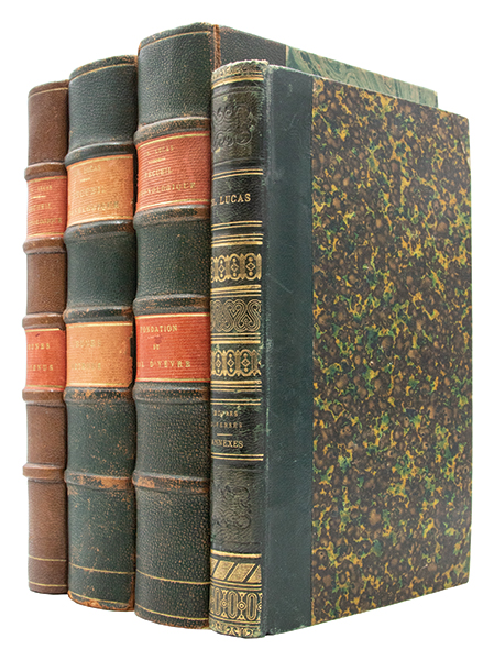 Ensemble de 62 pièces reliées en 4 volumes in-8°, 3 de demi-chagrin vert, dos à nerfs et un de demi-maroquin vert, dos lisse orné d'un décor romantique doré (reliures de lépoque).