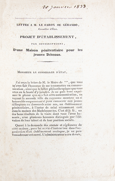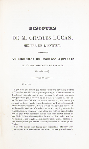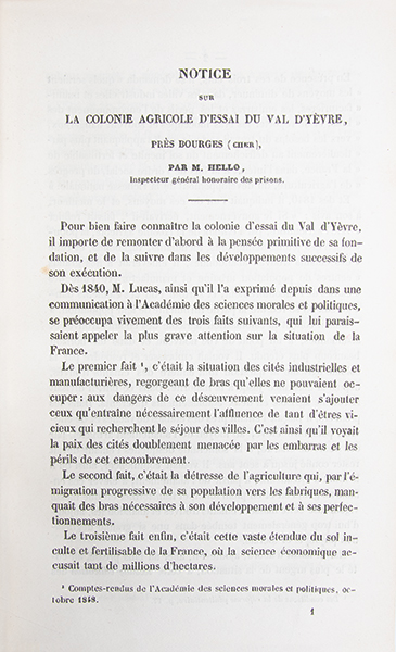Précieux recueil de 62 pièces (dont 15 en double), composé en partie de ses propres uvres, constitué par Charles Lucas pour sa bibliothèque personnelle. Chaque volume est précédé d’un index de sa main. Charles Lucas (1803-1899) est l’homme « qui, sans conteste, pendant le XIXe siècle, a le mieux incarné les ambitions et les ambiguïtés de la réforme pénitentiaire (…) et a fondé la Science des prisons » (J.G. Petit). Il personnifia le libéralisme pénal de la Restauration, jetant les bases d’un système pénitentiaire qui récusait l’emprisonnement perpétuel. Guizot le nomma inspecteur des prisons dès le changement de régime, en 1830. Il demeura trente-cinq ans à ce poste. À partir de 1830, l’engouement pour l’amélioration du système pénitentiaire suscita des centaines d’ouvrages. Charles Lucas se constitua une très riche bibliothèque spécialisée, augmentée des nombreuses brochures que l’inspecteur général des prisons recevait. On trouve ici une importante réunion de 21 plaquettes traitant de la colonie agricole du Val d’Yèvre qu’il avait fondée, en 1841, pour recevoir des jeunes délinquants. Après avoir acheté 140 ha de marais au Val dYèvre près de Bourges, Charles Lucas soumit son projet au ministère de lIntérieur qui ne le retint pas. En 1846, il décida de se lancer personnellement dans « laventure ». La construction coûta 450.000 francs et lEtat alloua 80 centimes par jour et par colon qui furent transférés de la prison de Fontevraud dès 1847 : 100 en 1850 puis 400 en 1860. En 1865, Charles Lucas devenu aveugle fut remplacé par son fils docteur en droit. En 1872, la colonie fut louée, puis acquise par lEtat et « nationalisée ». La loi de 1912 sur les tribunaux pour enfants entraîna une réduction progressive des effectifs jusquen 1924 pour le Val dYèvre ferma définitivement.