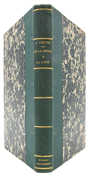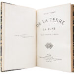 Edition originale dun des premiers romans de Jules Verne, complète du faux-titre, du feuillet derrata et des 17 pages de l »Extrait du catalogue de la Librairie Hetzel » in-fine. Le récit relate la préparation du lancement dun projectile habité vers la Lune. Inspiré par les progrès de la balistique, Verne y mêle humour, rigueur scientifique et imagination visionnaire. Ce livre figure parmi les plus célèbres de lauteur et demeure une oeuvre fondatrice de la science-fiction moderne, annonçant lexploration spatiale et influençant de nombreux écrivains et inventeurs. Plus dun siècle après sa parution, le livre fut cité par Neil Armstrong lors de son voyage lunaire à bord dApollo 11. (Gondolo della Riva, ‘Bibliographie des oeuvres de Jules Verne’, n°10, p. 16-17). Provenance : « Gournay Heurtebise » (dorée en pied): bibliothèque de lancien château dHeurtebise, à Gournay-sur-Marne. Très bon exemplaire, très frais, bien relié.