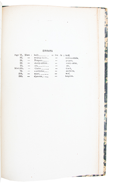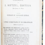 In-18 (177 x 113 mm), demi-percaline chagrinée vert bronze, dos à 5 nerfs garnis de filets dorés en place des nerfs, auteur et titre dorés, (4), 302, (1) f. d'errata, 17 pages "Extrait du catalogue de la librairie J. Hetzel".