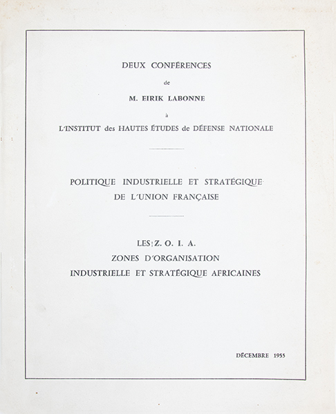 Tirage restreint. Texte de deux conférences données à lIHEDN par Eirik Labonne, diplomate et haut fonctionnaire, consacrées à la politique industrielle et stratégique de lUnion française, soit la vision économique et géopolitique élaborée par la France pour ses territoires coloniaux et associés après la Seconde Guerre mondiale. La seconde partie expose le rôle des Z.O.I.A. dans la planification et lorganisation du développement industriel en Afrique, dans une perspective stratégique et militaire. Document révélateur de la pensée économique et géopolitique française de laprès-guerre, destiné aux auditeurs civils et militaires de lInstitut. Bon exemplaire.