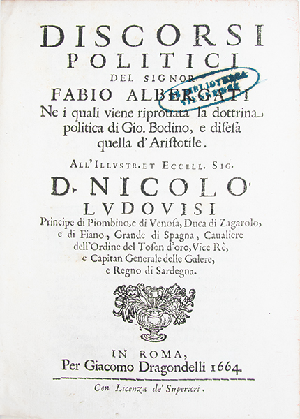 Troisième et dernière édition, état définitif de ce traité majeur de la pensée politique catholique du XVIIe siècle, conçu comme une réfutation systématique des « Six Livres de la République » de Jean Bodin. Juriste et diplomate bolonais, Fabio Albergati (1538-1606) sinscrit dans laristotélisme de la Contre-Réforme et mène une critique méthodique de la souveraineté bodinienne, jugée détachée de toute finalité morale. Contre lorigine violente de lÉtat postulée par Bodin, il affirme son fondement naturel et téléologique, subordonné au bien commun. Il substitue à la typologie numérique des régimes une classification éthique et défend la supériorité de la monarchie pure. Hostile à la tolérance religieuse bodinienne, quil juge dinspiration calviniste, il définit la fin de la société civile comme « vivere onesto e felice ». Texte central de la réaction catholique contre lautonomisation moderne du politique, louvrage a également été interprété comme une utopie politique du bon gouvernement. (S. Michel, ‘Ouvrages imprimes en langue italienne au XVIIe s.’, I, 56. Negley, ‘Utopian Literature’, p. 153). Quelques rousseurs éparses. Cachet ex-libris sur le titre. Provenance: les comtes d’Harrach, ex-libris manuscrit sur la première garde et cachet: « Ex Bibliotheca Viennense » sur le titre. Bel exemplaire, bien conservé dans sa première reliure de vélin doré.