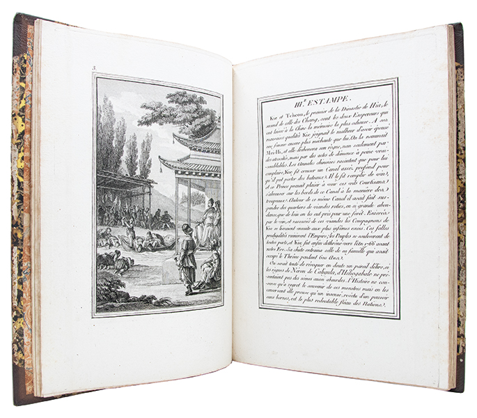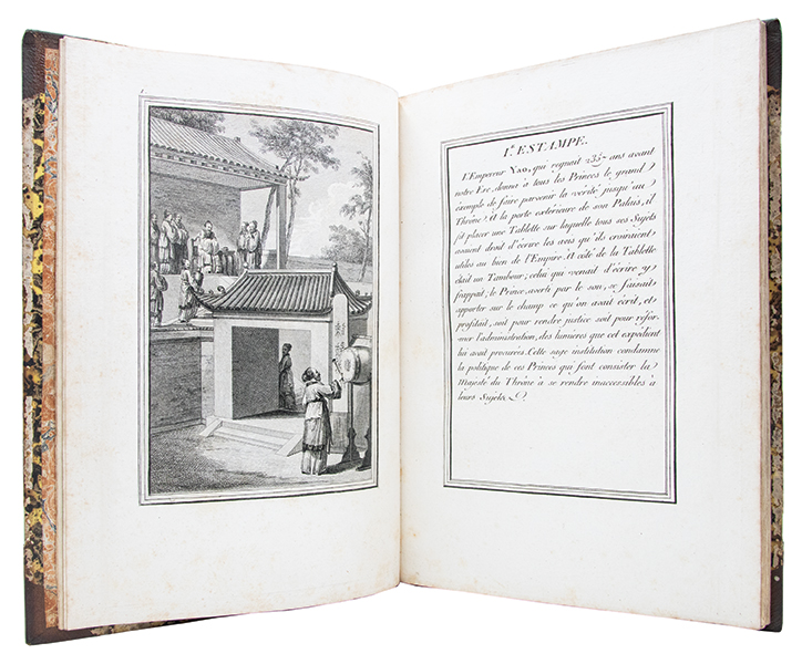Exceptionnel exemplaire du roi Louis-Philippe, relié par Simier, l’un des très rares tirages sur papier vélin. Les dessins originaux furent exécutés en Chine par le jésuite Jean-Denis Attiret (1702-1768), peintre à la cour de l’empereur, sur ordre impérial, et par l’intermédiaire de la Compagnie des Indes. Selon Cohen, la direction artistique des planches fut confiée à Charles-Nicolas Cochin à Paris. La majorité des épreuves fut envoyée en Chine et seules quelques très rares feuilles demeurèrent en Europe ; ce sont elles qui servirent de modèles à Isidore Stanislas Helman pour la gravure des vingt-quatre estampes. L’ouvrage constitue un témoignage exemplaire de la sinophilie éclairée de la fin du XVIIIe siècle, associant vulgarisation savante de l’histoire chinoise et raffinement esthétique inspiré des arts d’Asie. Chaque planche, gravée avec soin par Helman, illustre une anecdote du règne d’un empereur chinois, accompagnée d’un texte explicatif qui en propose une lecture morale et historique, mise en perspective avec l’histoire européenne. (Cohen-Ricci, col. 479). Provenance prestigieuse : Le Roi Louis-Philippe (1773-1850), Louis-Philippe d’Orléans; reliure à son monogramme et à ses armes, timbres à l’encre rouge « Duc d’Orléans » et à l’encre bleue « Bibliothèque du Bois de Neuilly ». L’exemplaire figure au ‘Catalogue de livres provenant des bibliothèques du feu roi Louis-Philippe, bibliothèques du Palais-Royal et de Neuilly’. Deuxième partie, Paris, 1852, n° 2303. Ex-libris armorié gravé de la bibliothèque de M. Emmanuel Mancel. Quelques rousseurs et petites piqûres éparses. Bel exemplaire sur grand papier vélin, remarquablement relié à l’époque par René Simier (avant 1837), relieur du roi.