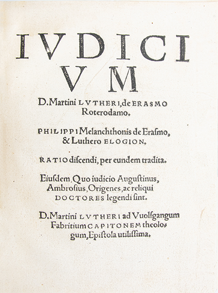 Edition originale, illustrée de deux grandes initiales historiées gravées sur bois, de ce recueil réunissant trois textes fondamentaux sur les relations complexes entre les figures majeures de la Réforme et lhumanisme érasmien. Le premier, ‘Iudicium Lutheri de Erasmo’, livre un jugement théologique et moral sans concession de Luther sur Érasme, dans un style concis et polémique, révélateur des tensions croissantes entre les deux penseurs après leur célèbre controverse sur le libre arbitre (‘De servo arbitrio’ vs ‘De libero arbitrio’). Le second texte, attribué à Philipp Melanchthon, adopte un ton plus mesuré: il rend hommage aux qualités intellectuelles dÉrasme, tout en soulignant les divergences doctrinales qui le séparent de la Réforme. Enfin, ‘Ratio discendi’, attribué à Luther, propose une réflexion sur lart dapprendre, fidèle à sa vision pédagogique fondée sur la lecture directe des Écritures et des textes fondamentaux, loin des méthodes scolastiques. Lensemble illustre à la fois les convergences initiales, puis les ruptures entre lhumanisme chrétien et la pensée réformée, et éclaire un moment charnière du XVIe siècle, où se rencontrent les enjeux de la foi, de la philologie et de lautorité scripturaire. (Benzing, ‘Lutherbibliographie’, n° 1087. Kuczynski, ‘Lutherbibliographie’, n° 1712. USTC, n°626370. VD16 L 6666). Provenance: le professeur Gerhard Eis (19081982), spécialiste de lhistoire médiévale à luniversité de Heidelberg, avec une petite étiquette posée en tête du contreplat supérieur. Bon exemplaire, frais, bien conservé.