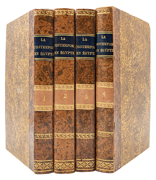 4 volumes in-8 (192 x 122 mm), demi-veau moucheté, dos lisses ornés de compartiments cloisonnés d'une grecque en places des nerfs, pièces de titre et de tomaison de veau noire et havane, palette en pied, plats de papier raciné, tranches citron (reliure romantique de l'époque), (4), xvi, 384 p., (4), 419 p., (4), 399 p. et (4), 391 p.