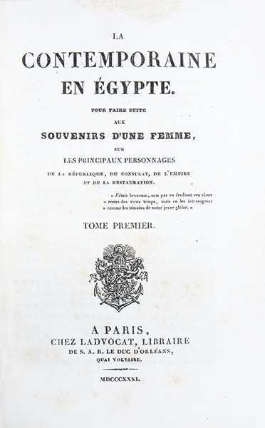 La Contemporaine en Égypte. Pour faire suite aux Souvenirs d’une Femme, sur les Principaux Personnages. De la République, du Consulat, de l’Empire et de la Restauration.