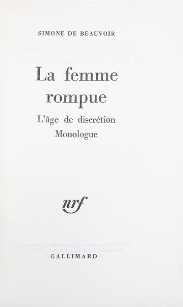 Edition originale tirée à cent soixante-quinze exemplaires numérotés, celui-ci sur vélin pur fil Lafuma-Navarre (n°138), second grand papier. Ce recueil de trois nouvelles: ‘LÂge de discrétion’, ‘Monologue’ et ‘La Femme rompue’, marque le retour de Simone de Beauvoir à la fiction après une décennie autobiographique. Explorant laliénation féminine à travers des formes narratives variées (journal, flux de conscience, monologue intérieur), loeuvre prolonge lexistentialisme sartrien dans une perspective féministe. La réception, décevante, fut analysée par S. Dow (in ‘Modern Language Review’, 2005) comme un malentendu critique révélant le sexisme de lépoque ; Beauvoir y vit une incompréhension de son projet. Réévalué depuis les années 1990, le texte est désormais un jalon majeur de la littérature féministe du XXe siècle. (Francis & Gontier, ‘Les écrits de Simone de Beauvoir’, p. 232). Mors très légèrement frottés. Bel exemplaire, très frais, bien relié, non rogné les témoins sont conservés.