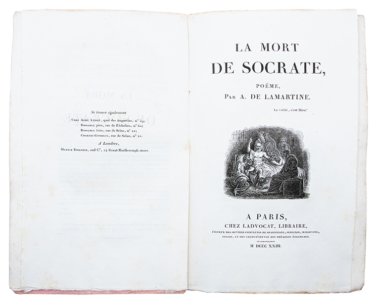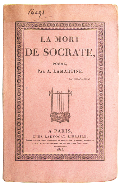 Édition originale de l’une des premières oeuvres du poëte. Conçu durant l’hiver 1822-1823, le poëme naît de la découverte de la philosophie de Platon par le jeune auteur, sous l’influence de son ami Charles de Fréminville. La figure de Socrate y est élevée au rang de modèle. Lamartine dépasse la simple évocation antique en interprétant le philosophe comme un précurseur de la révélation chrétienne. L’œuvre annonce les orientations religieuses et méditatives des ‘Méditations poétiques’. « Poème de grande valeur formelle et spirituelle, injustement méconnu. Lamartine voit en Socrate un précurseur de la révélation chrétienne » (M. F.Guyard cité par Émile Magnien). (Vicaire, IV, 958). Quelques petites piqûres éparses. Très bon exemplaire, imprimé sur vergé, non rogné, très que paru sous sa couverture de parution imprimée et ornée.
