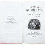 In-8 (212 x 140 mm), couverture de parution rose imprimée ornée d'une lyre, 146 pages (prospectus de souscription et avis libraire inclus), vignette de titre gravée par Thompson (Socrate le verre de ciguë à la main haranguant ses disciples), fleurons, culs-de-lampe.