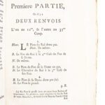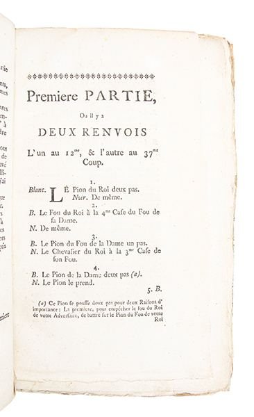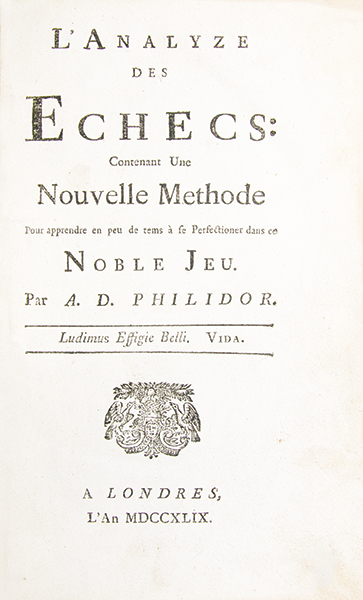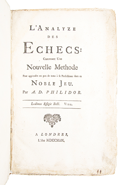 Deuxième édition à la date de loriginale, reconnaissable à son fleuron de titre à la double corne dabondance (« cornucopia »). François-André Danican Philidor (17261795), compositeur de musique renommé issu dune illustre famille de musiciens et meilleur joueur déchecs de son temps, se rendit célèbre par ses parties simultanées à laveugle. Avec cet ouvrage, il signe le traité fondateur de la théorie moderne du jeu, le premier à privilégier la stratégie à long terme sur le calcul tactique, il analyse la structure des pions, développe les principes douverture, étudie les finales et commente des parties entières. Véritable « Discours de la méthode » appliqué aux échecs, illustré de diagrammes, ce livre rompt avec les conceptions antérieures pour formaliser un système rationnel et établir des principes encore en usage. Rapidement traduit dans toute lEurope, il exerça une influence décisive et demeura une référence de la littérature échiquéenne. Toutes les impressions de 1749 sont rares ; Hoefer, dans sa Nouvelle Bibliographie générale (t. XII, p. 935), affirme nen avoir jamais vu dexemplaire. (Conlon, ‘Siècle des Lumières’, 49:782. Linde-Niemeijeriana, Chess collection, n°445). Auréole claire en marge des 3 premiers feuillets et qqs rousseurs éparses. Bon exemplaire bien relié, entièrement non rogné, les témoins ont été conservés.