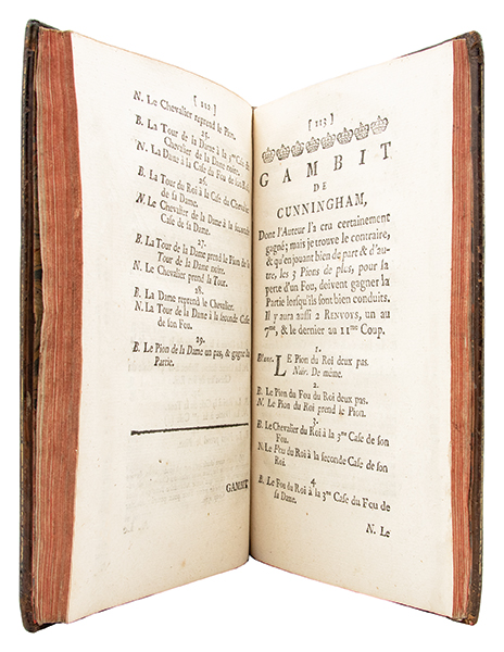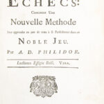 Troisième édition datée de loriginale, ornée dun fleuron de titre aux oiseaux (dit « pecking birds »). François-André Danican Philidor (17261795), compositeur renommé issu dune illustre famille de musiciens et meilleur joueur déchecs de son temps, se fit connaître par ses parties simultanées à laveugle. Par cet ouvrage, il donne le traité fondateur de la théorie moderne du jeu : premier à privilégier la stratégie à long terme plutôt que le seul calcul tactique, il analyse la structure des pions, fixe les principes douverture, étudie les finales et commente des parties complètes. Véritable « Discours de la méthode » appliqué aux échecs, illustré de diagrammes, ce livre rompt avec les conceptions antérieures, formalise un système rationnel et établit des principes toujours en usage. Diffusé dans toute lEurope par ses traductions, il exerça une influence décisive et demeura une référence de la littérature échiquéenne. Toutes les impressions de 1749 sont rares ; Hoefer, dans sa « Nouvelle Bibliographie générale » (t. XII, p. 935), déclare nen avoir jamais vu dexemplaire. (Niemeijer, « Chess collection », n° 446). Provenance : « Bonnet Louis le 1er février 1831. Ce livre appartient a moi louis Bonnet fils de Nicolas » (ex-libris manuscrit). Minimes traces de restauration sur la reliure. Très bon exemplaire, bien relié à lépoque.