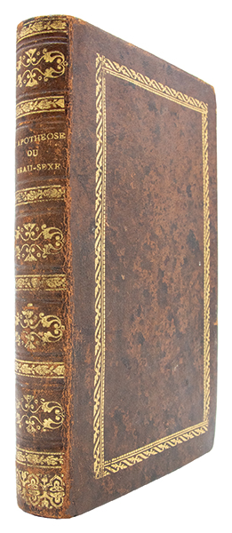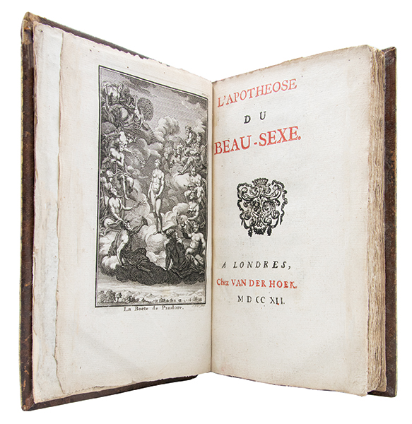Edition originale et unique de l’une des spéculations libertines les plus hardies de la période: le sexe ici est à prendre à son sens littéral de « parties génitales de la femme ». « L’auteur se propose de vouer un culte religieux aux organes sexuels féminins et justifie la légitimité de ce choix et l’opportunité d’un retour au paganisme naturel. ‘L’apothéose’ du sexe féminin est réclamée au nom de la Raison (p.64). Le plaisir sexuel est « le seul des plaisirs parfaits, parce qu’il occupe à la fois & les parties du corps et les facultés de l’Âme » (p.128) (…). En conclusion, il convient de « regarder ces Parties comme quelque chose de très vénérable et de très aimable en même temps » (p.85). Quant aux « sacrifices » que l’auteur se propose d’offrir à ces divinités, on devine quels ils sont. C’est au lieu même de ces sacrifices, conformes à la raison naturelle, que la supériorité de la femme [dont l’endurance sexuelle est l’un des atouts] peut enfin être sans conteste établie » (cf. longue analyse in M. Angenot, ‘Les champions des femmes…’, PU du Québec, 1977, p. 75-77). L’attribution par Brunet à A.-F. Boureau Deslandes n’est pas retenue par Jean Macary, le biographe de cet auteur. Le lieu de publication est fictif, il s’agit sans doute d’Amsterdam. La date, imparfaitement imprimée sur la page de titre, pourrait laisser croire qu’il s’agit de 1712, erreur souvent reprise; il s’agit bien de 1741. Le frontispice intitulé « La boëte à Pandore » est l’oeuvre du graveur et marchand d’art amstellodamois Pieter Yver (1712-1787). (Gay I, 258). Coupes frottées. Rares rousseurs. Bon exemplaire, couverture en papier dominoté de l’époque conservée.