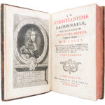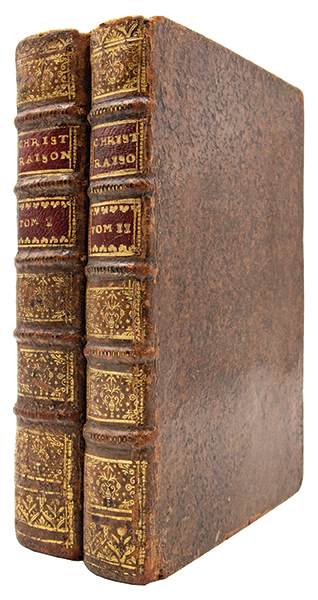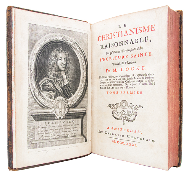 Troisième édition augmentée de la traduction française, par Pierre Coste, de ‘The Reasonableness of Christianity’, édition qui contient « La Religion des Dames » et la « Dissertation sur la réunion des chrétiens ». Plaidoyer en faveur de la tolérance religieuse, louvrage était destiné à fournir un fondement théorique rationnel à une réconciliation religieuse des chrétiens, mais il fut accusé de socianisme et Toland y emprunta des arguments à l’appui de son ‘Christianisme sans mystère’. La traduction de Pierre Coste, protestant français réfugié en Angleterre au moment de la révocation de l’Édit de Nantes, est fidèle au texte original (« fairly faithful »); selon Yolton, le texte français aurait été revu et corrigé par Coste sous la surveillance de Locke lui-même. (Yolton, ‘Locke, A Descriptive Bibliography’, n° 244). Coiffe supérieure d’un volume usée, qqs accrocs et épidermures. Rousseurs éparses. Bon exemplaire.
