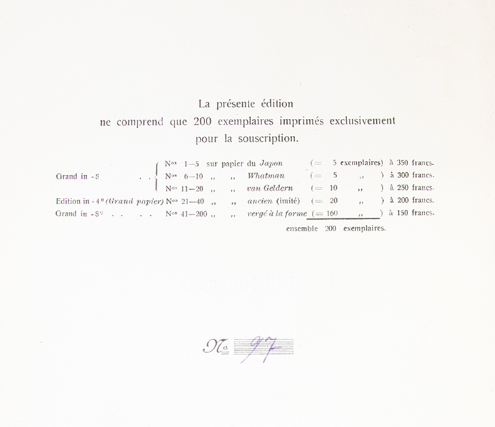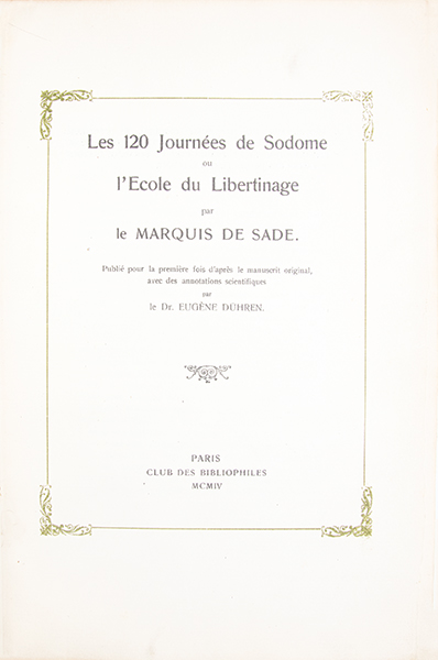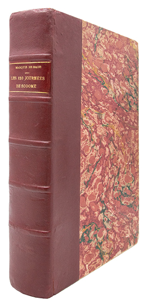 Edition originale publiée en 1904 à Berlin par Max Harrwitz. Un des 160 exemplaires imprimés sur vergé à la forme (justifié n°97) sur un tirage total de 200 exemplaires. La traduction et les notes sont loeuvre du docteur Iwan Bloch (1872-1922), biographe de Sade, dissimulé sous le pseudonyme dEugène Dühren. Médecin, sexologue et psychiatre allemand, Bloch avait acquis le célèbre manuscrit rédigé par Sade en 1785 à la Bastille. Cet extraordinaire manuscrit, composé de 33 feuillets collés bout à bout pour former un rouleau de 12,10 mètres de long sur 11,3 cm de large, écrit au recto et au verso, est aujourd’hui conservé à la Bibliothèque nationale de France (BnF). « S’il y a un enfer dans les bibliothèques, c’est pour un tel livre. On peut admettre que, dans aucune littérature d’aucun temps, il n’y a eu un ouvrage aussi scandaleux, que nul autre n’a blessé aussi profondément les sentiments et les pensées des hommes » (Maurice Blanchot). (Dutel, 131. ‘Eros invaincu’, n° 47. Pia, ‘Livres de l’Enfer’, 1998, col. 187-189). Quelques minimes épidermures au dos. Très bon exemplaire, très frais, non rogné, témoins conservés.