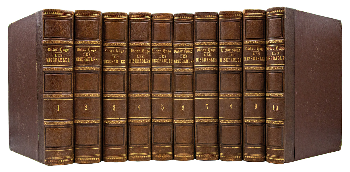 Edition originale de première émission pour l’ensemble des volumes, tous dépourvus de mention d’édition. Il est aujourd’hui établi que cette édition publiée à Bruxelles, de mars à juin 1862, est l’originale et qu’elle a antériorité sur l’édition parisienne. « Edition qui doit être et reste une édition princeps », comme le déclara Hugo à Lacroix le 19 mars 1862, ce quil confirma en 1866, en notant dans son exemplaire des ‘Travailleurs de la mer’: « Depuis que jai MM. Lacroix, Verboeckhoven et Cie pour éditeurs, cest toujours lédition belge princeps qui doit servir de type aux éditions futures ». Ainsi, c’est sur ce tirage bruxellois qu’Henri Scepi et Dominique Moncondhuy ont fondé la nouvelle édition Pléiade (2018) du chef-d’oeuvre de Hugo. Par ailleurs, selon Vicaire: « Dans cette édition belge se trouve un certain nombre de phrases qui, ayant paru dangereuses pour la France, ont été modifiées dans l’édition française » (Vicaire). (Carteret, ‘Romantique’, I, 421. Clouzot, 150. Vicaire, IV, 328). Quelques rares rousseurs éparses. Infimes accrocs à la reliure. Bel exemplaire, grand de marges, très frais, très bien relié à l’époque.