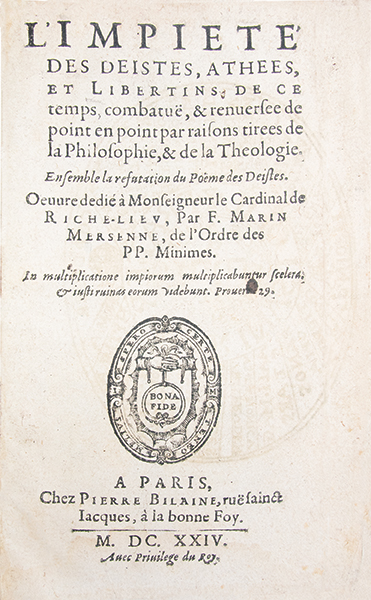 Édition originale (première partie) d’un des premiers ouvrages du père Mersenne (1588-1648). Œuvre majeure de l’apologétique catholique au seuil de la modernité, elle s’inscrit dans l’Europe post-réformée, confrontée à la montée du libertinage érudit et de l’athéisme inspiré de Lucrèce, Épicure, Cardan, Charron et Giordano Bruno. Mersenne y expose avec une fidélité remarquable les doctrines naturalistes et rationalistes qu’il réfute méthodiquement, conservant ainsi la trace de nombreux textes hétérodoxes dont certains sont aujourd’hui perdus. Alliant thomisme, philosophie péripatéticienne et premiers arguments du mécanisme scientifique, il cherche à démontrer la cohérence rationnelle de la foi. Sa méthode annonce le rationalisme cartésien et préfigure Pascal dans la conciliation de la raison et de la religion. En réfutant les libres penseurs, Mersenne leur ouvre une véritable tribune et propage leur pensée dans le débat public. En voulant ruiner l’athéisme, il lui a offert sa première anthologie. Une seconde partie de cet ouvrage parut quelques mois plus tard sous un titre légèrement différent. (Brunet, III, 1662. Desportes ‘Bibliographie du Maine’, 493-494. Pintard, ‘Libertinage érudit’, bibliographie, n° 927).. Galerie de ver dans la marge inférieure des pages 87 à 130, sans atteinte au texte. Auréoles claires éparses, parfois plus prononcées. Bon exemplaire.