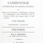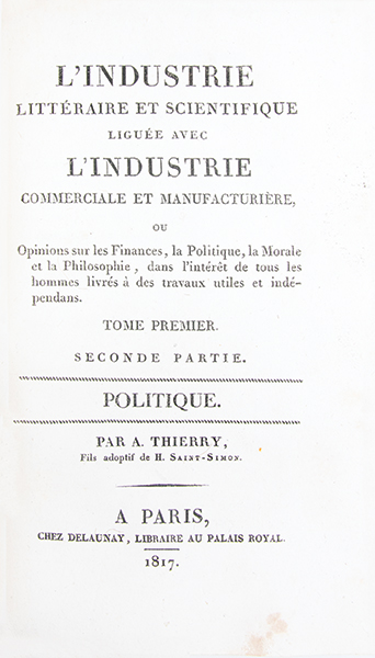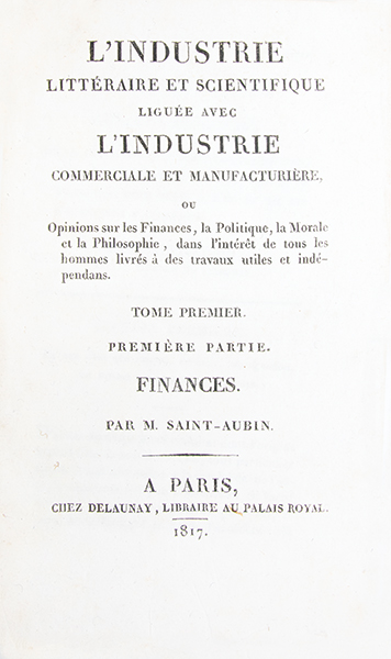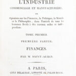 Edition originale, publiée par Saint-Simon de cet ouvrage distribué hors commerce. Dans cet ouvrage Saint-Aubin et Augustin Thierry, disciples de Saint-Simon, exposent lidée que toute société moderne doit être réorganisée autour de lindustrie. La première partie, consacrée à la finance, montre que le capital et le crédit ne sont que des moyens et doivent être subordonnés à la véritable source de richesse, cest-à-dire la production industrielle. La seconde, sur la politique, affirme que le pouvoir ne doit plus revenir aux héritiers de laristocratie ni aux partis, mais aux producteurs eux-mêmes, quils soient manufacturiers, commerçants, savants ou écrivains. Par cette démarche, les auteurs traduisent la vision saint-simonienne : unir la production matérielle et la production intellectuelle, placer les savants et les industriels à la tête de la société et faire de la politique lart dadministrer la production pour lutilité générale. L’ouvrage devait être prolongé par une troisième partie. (H. Mori, ‘Bibliographie de C. H. de Saint Simon’, n° 48 et 50). Mors légèrement frottés. Envoi autographe signé: « A Monsieur Louis Greffulhe de la part de la Société » et ex-libris gravé de la bibliothèque de Bois-Boudrau: le banquier et homme politique français Louis-Charles, comte Greffulhe (1814-1888). Bon exemplaire, frais, bien conservé.