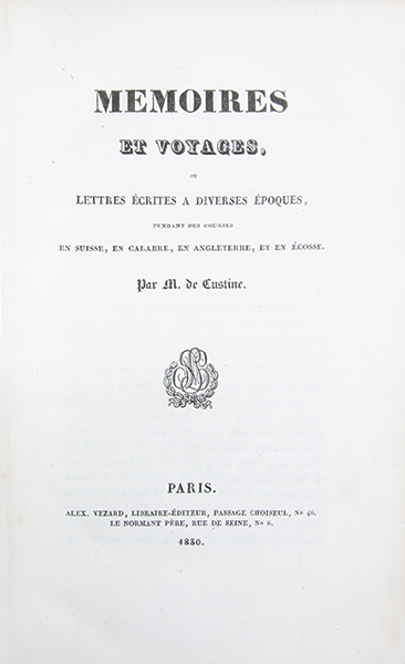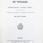 Edition originale rare de ce recueil dans lequel Astolphe de Custine (1790-1857) rassemble ses premiers récits de voyage, rédigés sous forme de lettres au fil de ses parcours en Suisse, en Calabre, en Angleterre et en Écosse. Jeune voyageur romantique, il explore lEurope entre 1811 et 1822, décrivant paysages, moeurs et rencontres avec vivacité et sens du tableau. Des montagnes aux salons londoniens, il mêle aventures personnelles, observations sociales et réflexions morales en une vision du monde lucide, critique et profondément sensible. Plus tard, dans « La Russie en 1839 », Custine confiera que le voyage est pour lui une source de joie intime : En voyage, jaime à ne rien perdre de mes premières impressions ; cest pour les sentir que je parcours le monde, et pour les renouveler que je décris mes courses. Petit manque angulaire de papier au dernier feuillet du second volume. Bel exemplaire, très frais, dans sa première reliure romantique de veau blond.