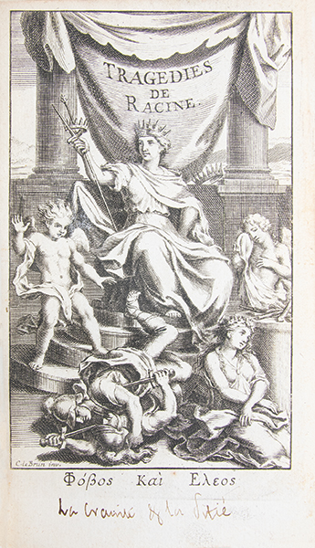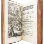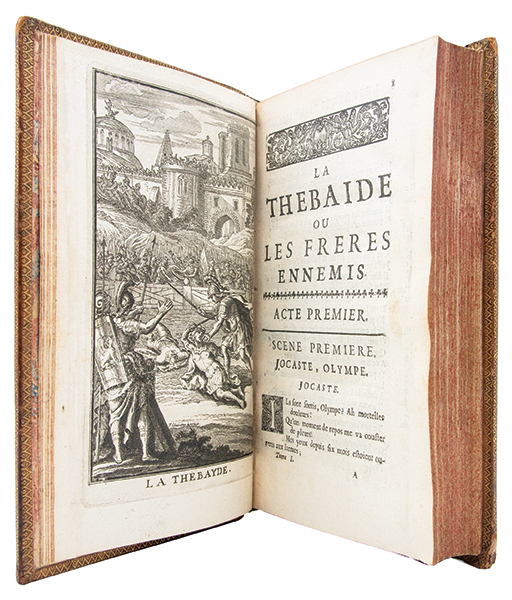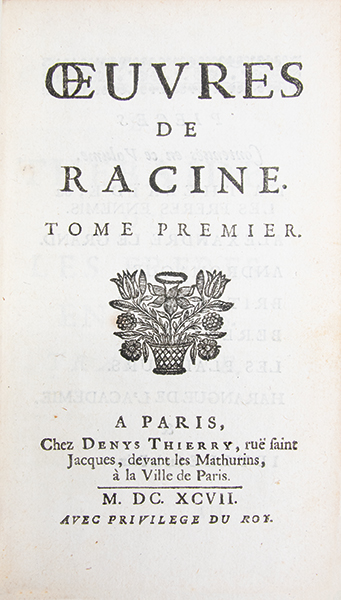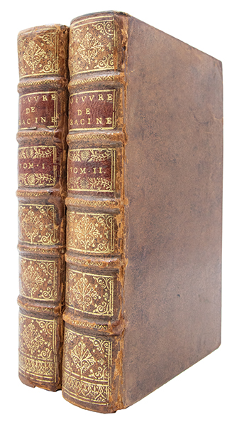Première édition complète des uvres de Jean Racine, troisième édition collective et dernière publiée du vivant de lauteur, revue, corrigée et augmentée par lui-même. « La première complète. Elle est plus recherchée que celle de 1687 » (Guibert). Elle réunit douze pièces, dont « Esther » (1689), « Athalie » (1691) et les « Cantiques spirituels » (1694), absents des précédentes éditions collectives. Publiée conjointement par Claude Barbin, Denys Thierry et Pierre Trabouillet, elle est illustrée dun frontispice daprès Charles Le Brun au tome I, et au tome II, dun frontispice non signé portant en médaillon « uvres de Jean Racine », de 10 figures dessinées et gravées par François Chauveau ainsi que de 2 figures non signées pour « Esther » et « Athalie » Selon Jules Le Petit (‘Éditions originales françaises’, p. 384): « Cette excellente édition est la dernière que Racine ait donnée, et elle a fixé le texte de toutes les éditions postérieures. Cest aussi la première qui soit complète. » (Cohen-de Ricci, 1077. Guibert, « Bibliogr. des uvres de Racine », p. 156-159. Tchemerzine-Scheler, V, p. 360). Très bel exemplaire, très bien relié à l’époque.