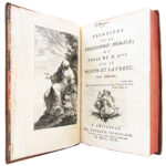 Edition originale du premier essai philosophique du jeune Diderot, illustrée de 2 planches gravées hors texte, 1 fleuron et 2 vignettes de Durand gravés par Fessard. « Cet exercice auquel se livra Diderot sur un original anglais fut davantage une paraphrase qu’une traduction. C’est un travail fort important pour saisir l’évolution de sa pensée. Il s’agissait de ‘An Inquiry concerning Virtue and Merit de Lord Shaftesbury’ (…). Il y avait quelque danger à présenter au public français, un ouvrage qui affirmait aussi franchement l’existence d’une morale naturelle, indépendant des sanctions d’une religion ou d’une Eglise données » (Wilson, Diderot, p. 44). Sur cet ouvrage capital « pour saisir l’évolution de la pensée de Diderot », cf. A. Wilson, p. 43 sq. et Venturi, ‘La jeunesse de Diderot’, passim. (Adams, PY1. Cohen, 306. Tchemerzine-Scheler, II, 916). Quelques petites rousseurs. Petit ex-libris effacé au titre. Bel exemplaire, très frais, grand de marges (164 x 105 mm), dans sa première reliure de veau moucheté.