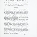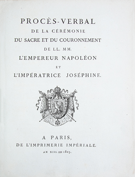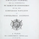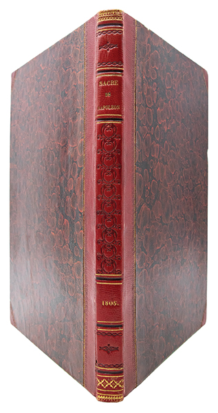Édition originale du procès-verbal de la cérémonie du sacre de Napoléon, rédigée sous la direction de Louis-Philippe de Ségur, grand maître des cérémonies de cette journée historique. Ce document officiel, précis et dune grande richesse descriptive, retrace avec minutie le déroulement de la cérémonie. Il en détaille chaque étape, énumère les personnalités présentes, indique la disposition des tribunes, décrit le décor intérieur et extérieur de la cathédrale de Paris, et reproduit les textes des discours, oraisons et autres interventions prononcés au cours de lévénement. (Davois, III, 116. Monglond, VI, 958). Coins frottés. Très bon exemplaire, très frais, très bien relié, imprimé sur grand papier de Hollande bleuté.