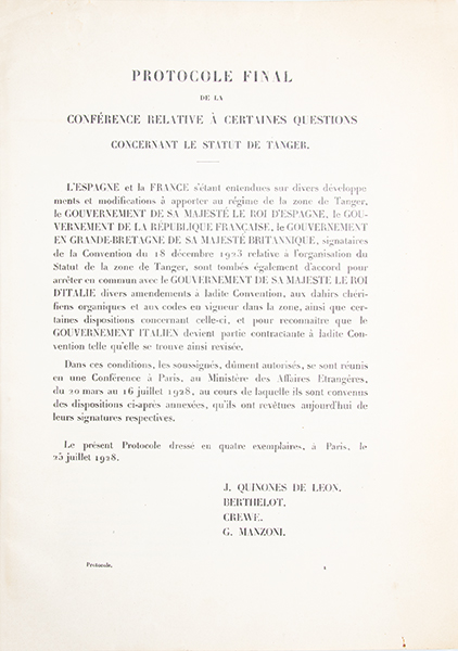 Protocole dressé à Paris le 25 juillet 1928 entre Quiñones de León, Berthelot, Crewe et G. Manzoni, représentants respectifs de lEspagne, de la France, de la Grande-Bretagne et de lItalie. Ce texte diplomatique fixe les modifications apportées au statut international de la zone de Tanger établi en 1923. Il contient également les « Lettres se rapportant à diverses clauses de l’accord », qui précisent et complètent certaines dispositions administratives, judiciaires et politiques. Document important pour lhistoire juridique et diplomatique du statut international de Tanger. Bon exemplaire. Rare.