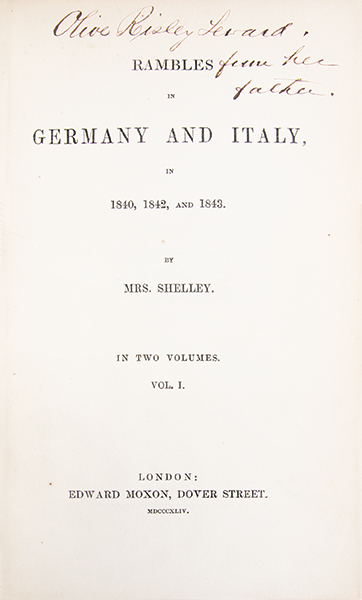 Édition originale de ce journal de voyage, fruit de trois périples de Mary Shelley (1797-1851) avec son fils et des amis, entre 1840 et 1843. L’autrice de ‘Frankenstein’ y entremêle impressions personnelles, descriptions de paysages rhénans, bavarois et italiens, analyses doeuvres dart (Raphaël, Michel-Ange) et réflexions sur le Risorgimento et lunification allemande naissante. Figure centrale du romantisme tardif, elle y affirme une voix féminine autonome, critique des conventions matrimoniales et sensible aux prémices du féminisme. En revisitant les sites liés à son mari Percy Bysshe Shelley, mort très jeune en en Italie en 1822, elle tisse une méditation élégiaque sur le deuil et la mémoire. Louvrage illustre la transition du Grand Tour aristocratique vers un tourisme lettré et bourgeois, tout en révélant l’engagement libéral de l’autrice face aux nationalismes européens. Source essentielle pour lhistoire culturelle du XIXe siècle, il préfigure le travelogue féminin et éclaire les mutations sociales de son temps. (T.J. Wise, ‘A Shelley Library’, p. 22) Provenance: Olive Risley Seward (1844-1908), fille adoptive du ministre et sénateur américain William Henry Seward (1801-1872), avec signature manuscrite et ex-libris gravé. Très bel exemplaire, très frais, bien relié.