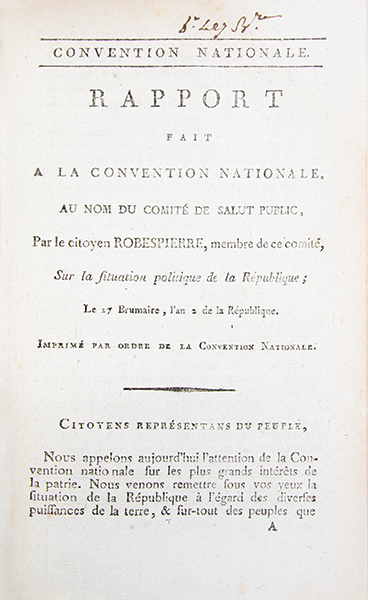 Rapport fait à la Convention nationale, au nom du Comité de salut public sur la situation politique de la République. Le 27 Brumaire, l’an 2 de la République [17 nov. 1793]. Imprimé par ordre de la Convention Nationale.