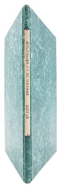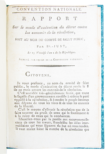 Edition originale de ce rapport historique. Le 13 ventôse an 2 (3 mars 1794), lors de la présentation du mode dexécution dun décret « contre les ennemis de la Révolution », Saint-Just développe une vision grandiose des objectifs de la Révolution et conclut son propos par une formule qui est entrée dans lhistoire: « Le bonheur est une idée neuve en Europe » (p. 2). (Martin & Walter, 30715A). Quelques petites piqûres éparses. Bon exemplaire.
